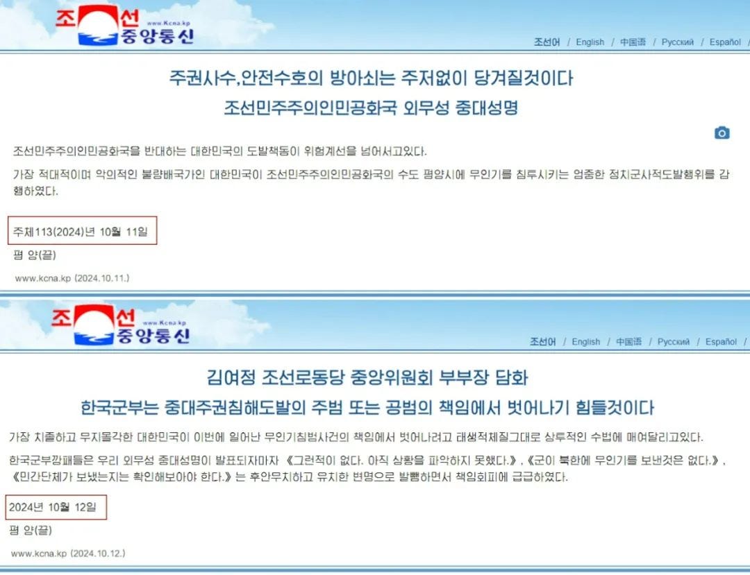 主体纪年命运的分水岭发生在2024年10月12日。当时正值韩国无人机渗透平壤事件,10月11日朝鲜外务省发布的《捍卫主权和安全的扳机将被毫不犹豫地扣动》声明,文末还写着"주체113(2024)년 10월 11일",第二天发表的《朝鲜劳动党中央委员会副部长金与正谈话》,最后的日期却突然变成了"2024년 10월 12일"。