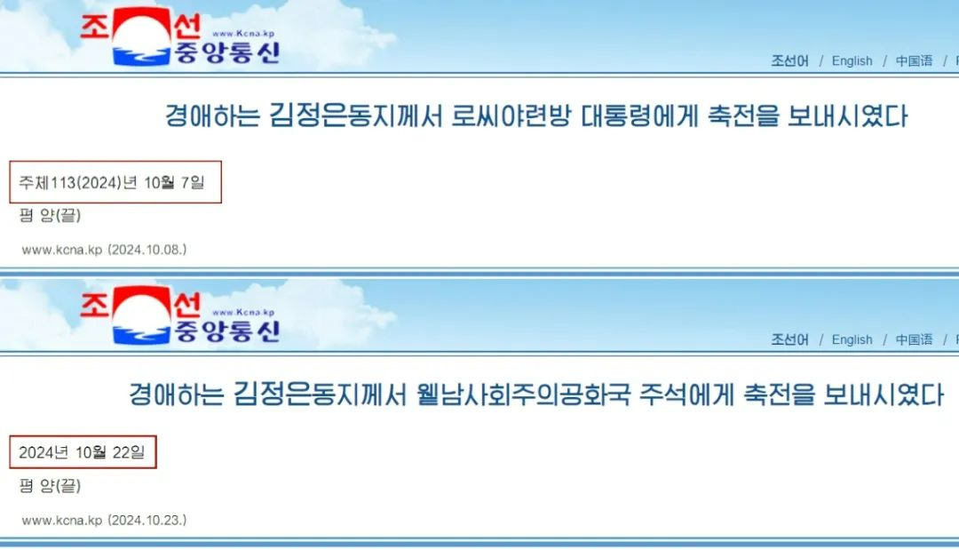 例如2024年10月7日的《敬爱的金正恩同志向俄罗斯联邦总统致贺电》,文末的时间还是"주체113(2024)년 10월 7일"。