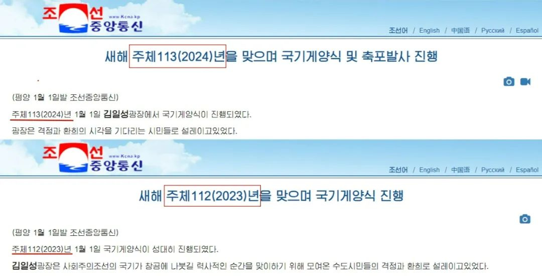 而在2024年元旦,新闻报道还是《새해 주체113(2024)년을 맞으며 국기게양식 및 축포발사 진행》(《为庆祝主体113年(2024年)新年,举行升旗仪式和贺礼鸣炮》)、前年则是《새해 주체112(2023)년을 맞으며 국기게양식 진행》(《举行升旗仪式,庆祝主体112年(2023年)》)。