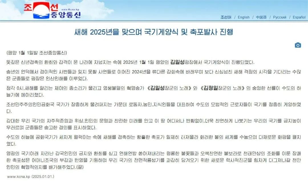 查看朝中社最新发布的报道:《새해 2025년을 맞으며 성대한 경축공연 진행》(《举行盛大的庆祝演出,迎接2025年新年》)、《새해 2025년을 맞으며 국기게양식 및 축포발사 진행》(《升旗仪式及鸣礼炮迎接2025年新年》),通篇已经不见"主体/주체"年号的影子。